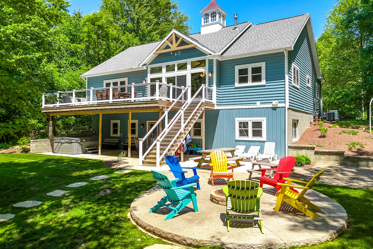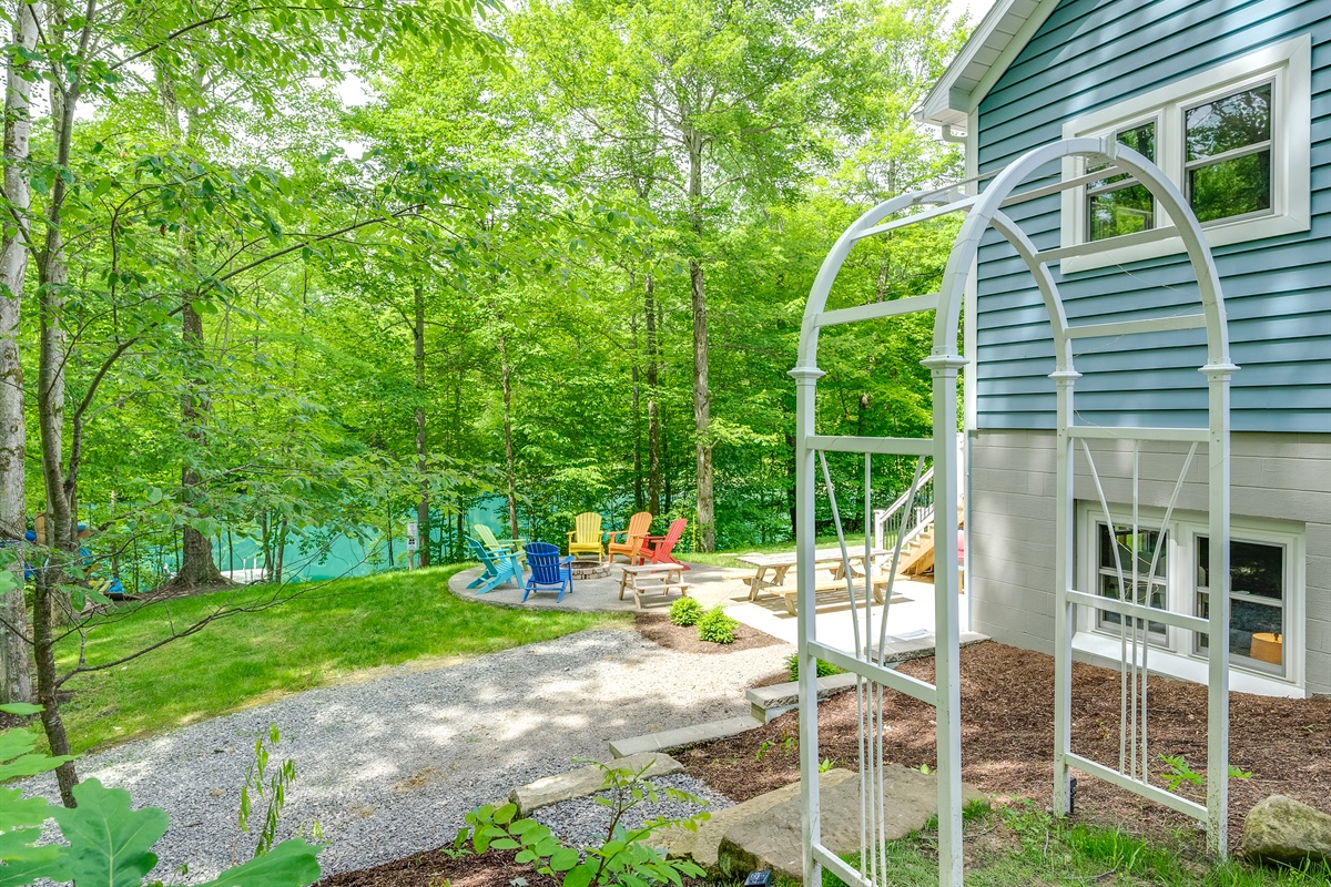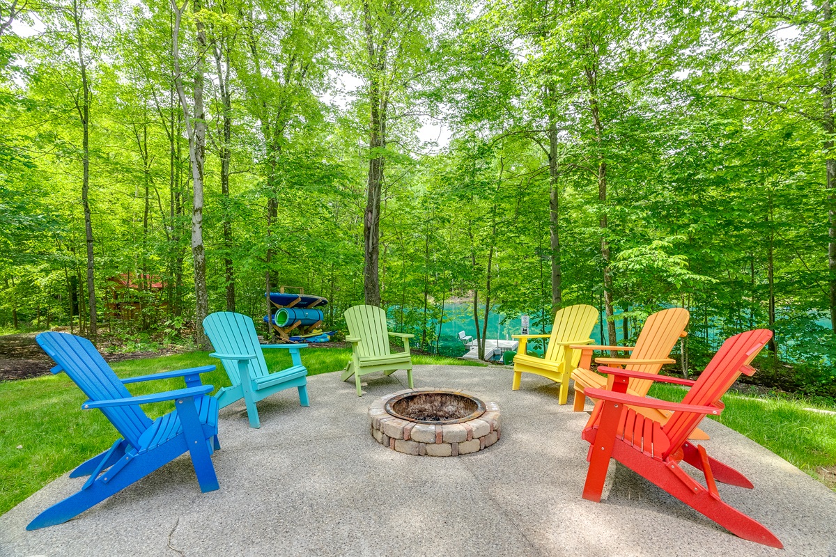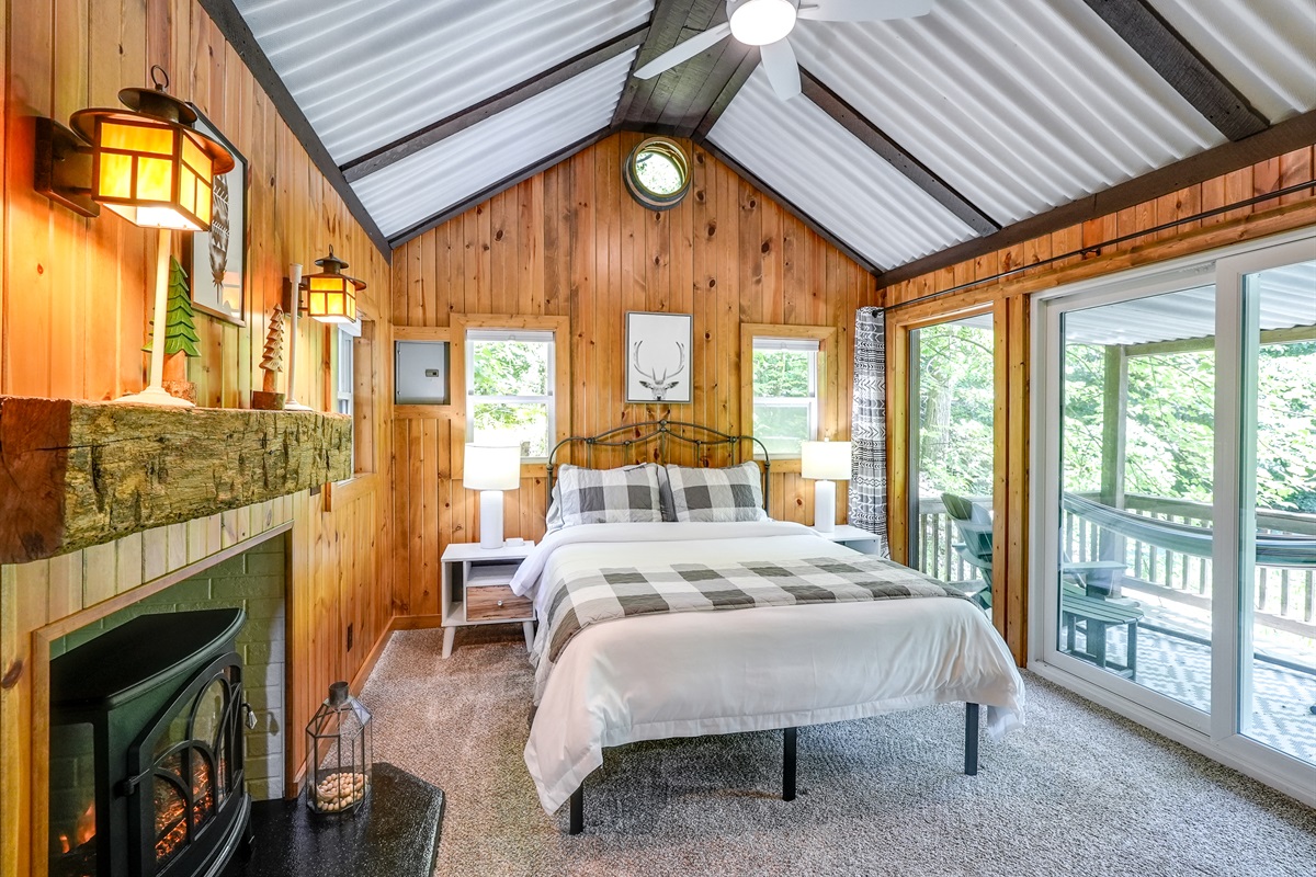 Off the game room, view of the firepit and pondGuest Cabin Main Level Bedroom – 1 Queen Bed