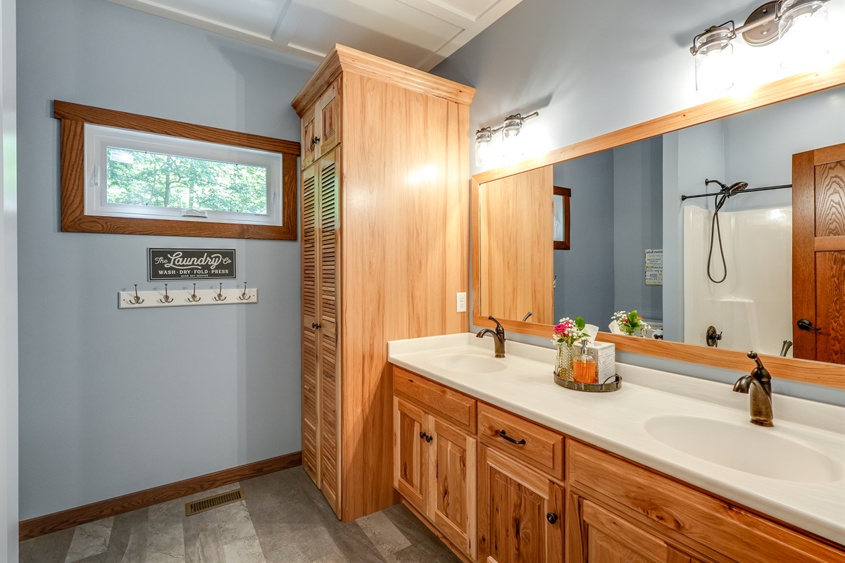 Off the game roomGuest Cabin Bathroom – Combination Tub/Shower, Toilet